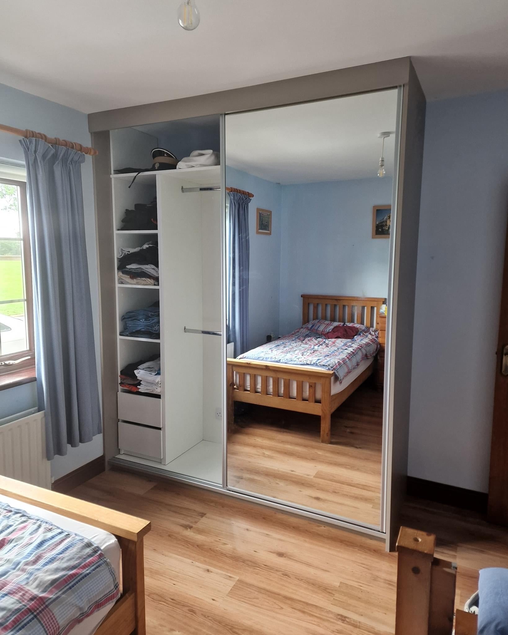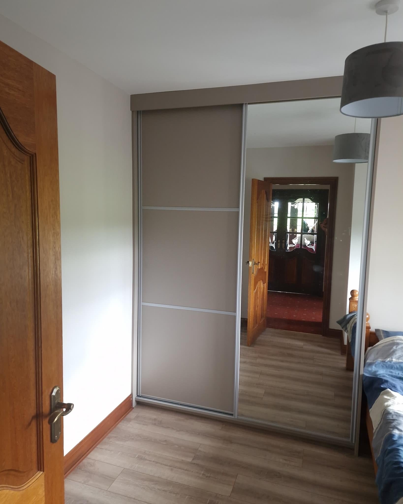 Grey, two door design with one mirror door.
