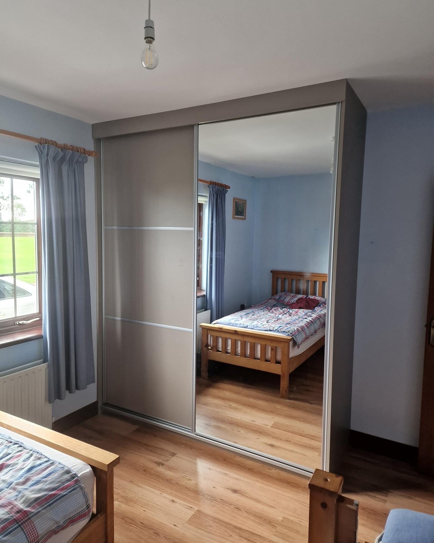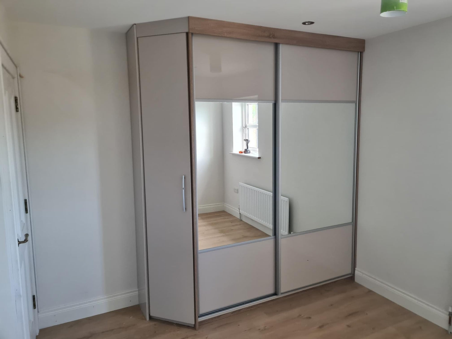 Classic sliding wardrobe with standard hinged door compartment. Click the button to see the design in more detail.