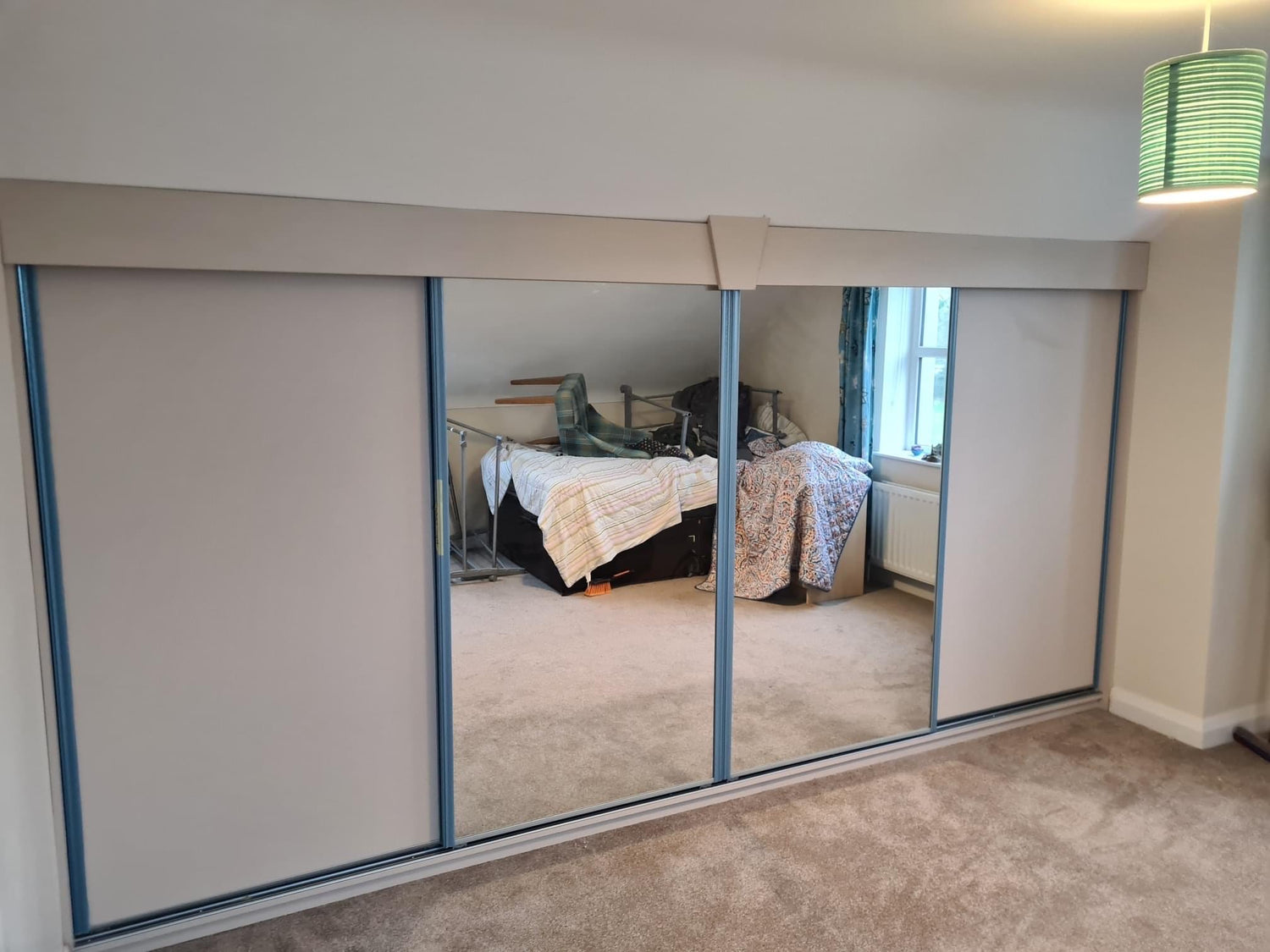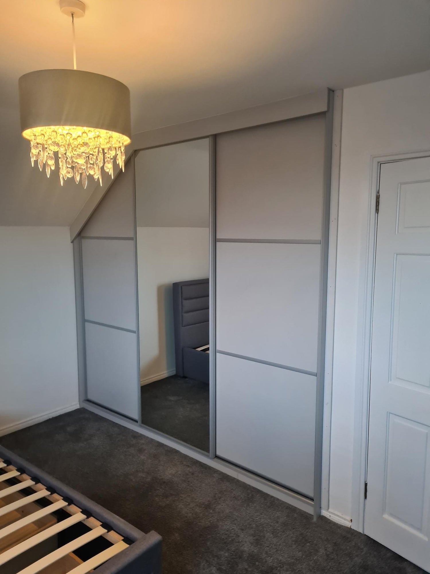 Design fitted for slanted ceiling, with three door design, one being a mirror door. Click the button to see the design in more detail.